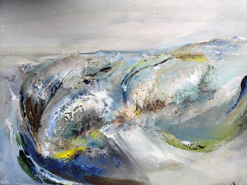 In het natuurlijke proces van schilderen ligt de kiem naar een andere wereld. De vorm laat zich langzamerhand waarnemen wanneer de één na de andere streek inzet. Ook vanuit een muzikale gedachte legt Meike de Vries de mogelijkheden van het materiaal neer op het doek.